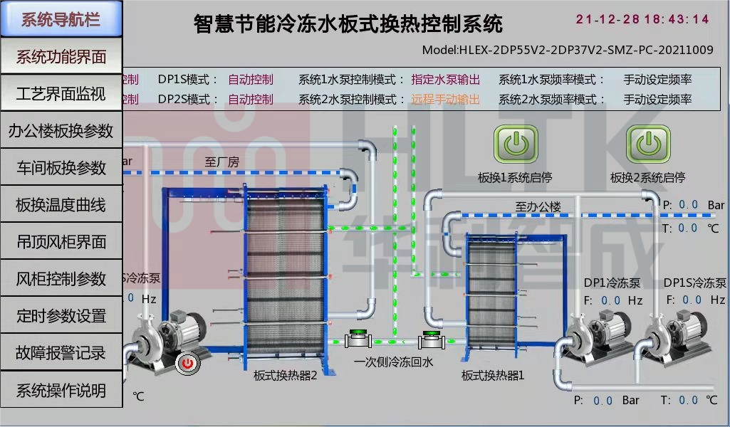 控制系統:控制系統通過PLC控制器和控制軟件,用于監測板式換熱器二次側的冷凍水進出口溫度給定一次側水泵的運行頻率,通過控
