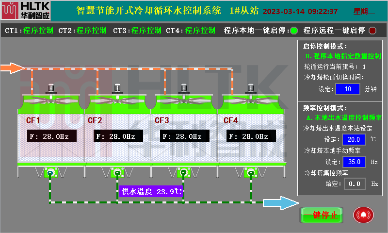 通過實時監測冷卻水系統供回水溫度及室外氣象參數,結合水塔的工作效率。通過控制系統作出高效模糊運算,動態調節風機頻率讓